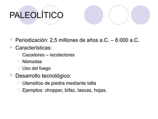 Este documento describe la evolución de la tecnología desde la Prehistoria hasta la actualidad. Comienza con las primeras herramientas de piedra del Paleolítico y continúa explicando los avances durante el Neolítico, la Edad de los Metales, las civilizaciones antiguas y la Edad Media, incluyendo invenciones como la rueda, el torno, la brújula y el reloj. Luego describe los avances científicos y tecnológicos de la Edad Moderna y la Revolución Industrial, incl