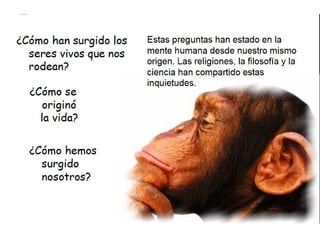 Este documento presenta las principales teorías sobre el origen de la vida. Describe la hipótesis de la panspermia, que sugiere que la vida proviene de moléculas orgánicas extraterrestres. También describe la hipótesis creacionista, la hipótesis de la síntesis prebiótica y la hipótesis de la generación espontánea. Explica las contribuciones de científicos como Oparin, Miller, Pasteur y Darwin y resume los principales hitos en el desarrollo de la teoría de la evol