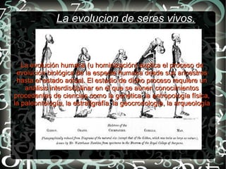 El documento habla sobre la evolución humana y el proceso de evolución biológica de la especie humana desde sus ancestros hasta el estado actual. Explica que este proceso requiere un análisis interdisciplinar de ciencias como la genética, antropología física y paleontología.