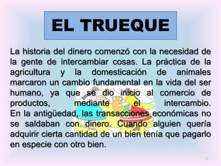 El documento resume la evolución de la moneda en Colombia, comenzando con el trueque en la antigüedad y progresando hacia las monedas acuñadas de metales preciosos como el oro y la plata. Luego describe los diferentes sistemas monetarios que ha tenido Colombia a lo largo de su historia, incluyendo el patrón oro y plata, el papel moneda, períodos de inflación y crisis económicas. Finalmente, explica brevemente el surgimiento de la moneda fiduciaria y escrita en la actualidad.