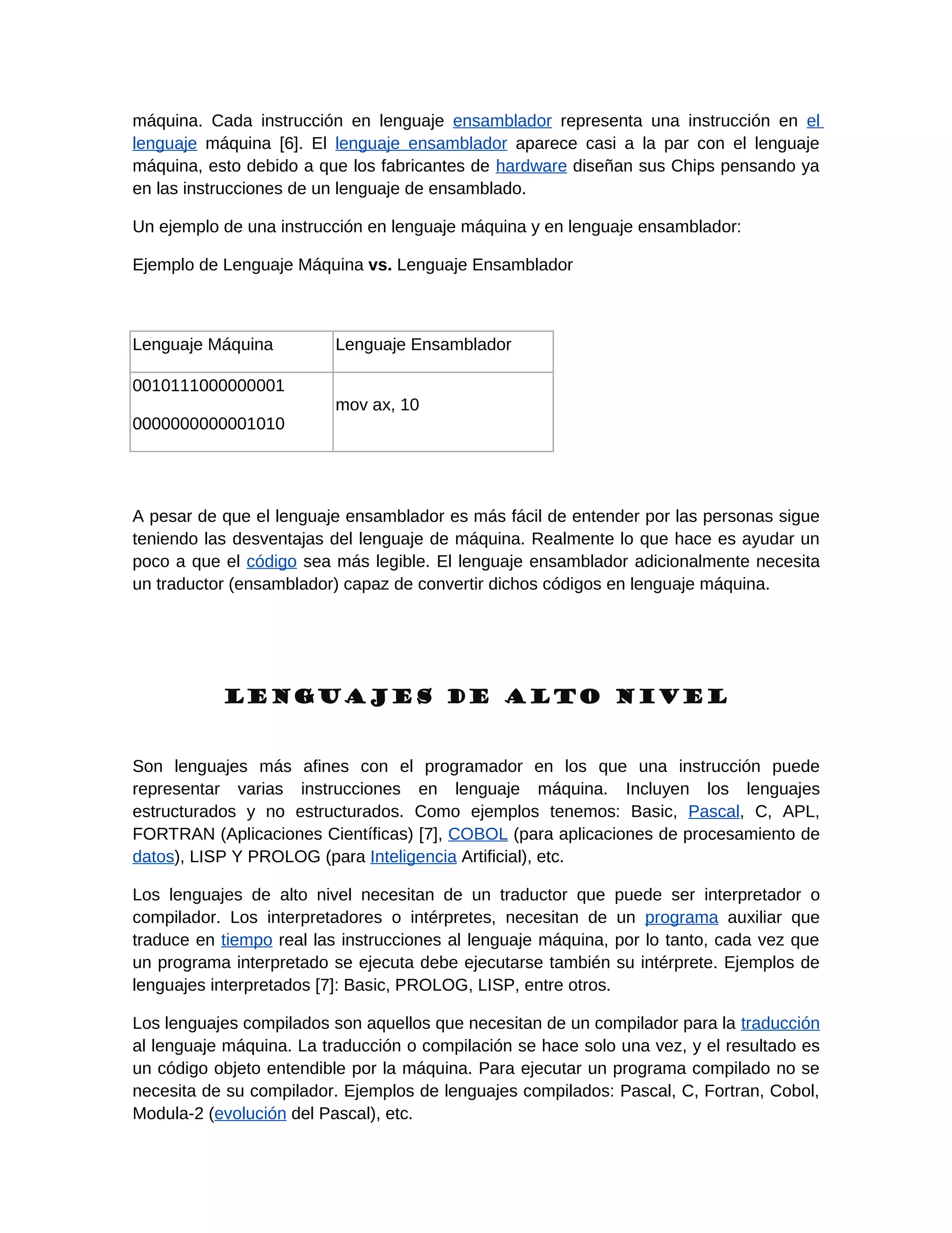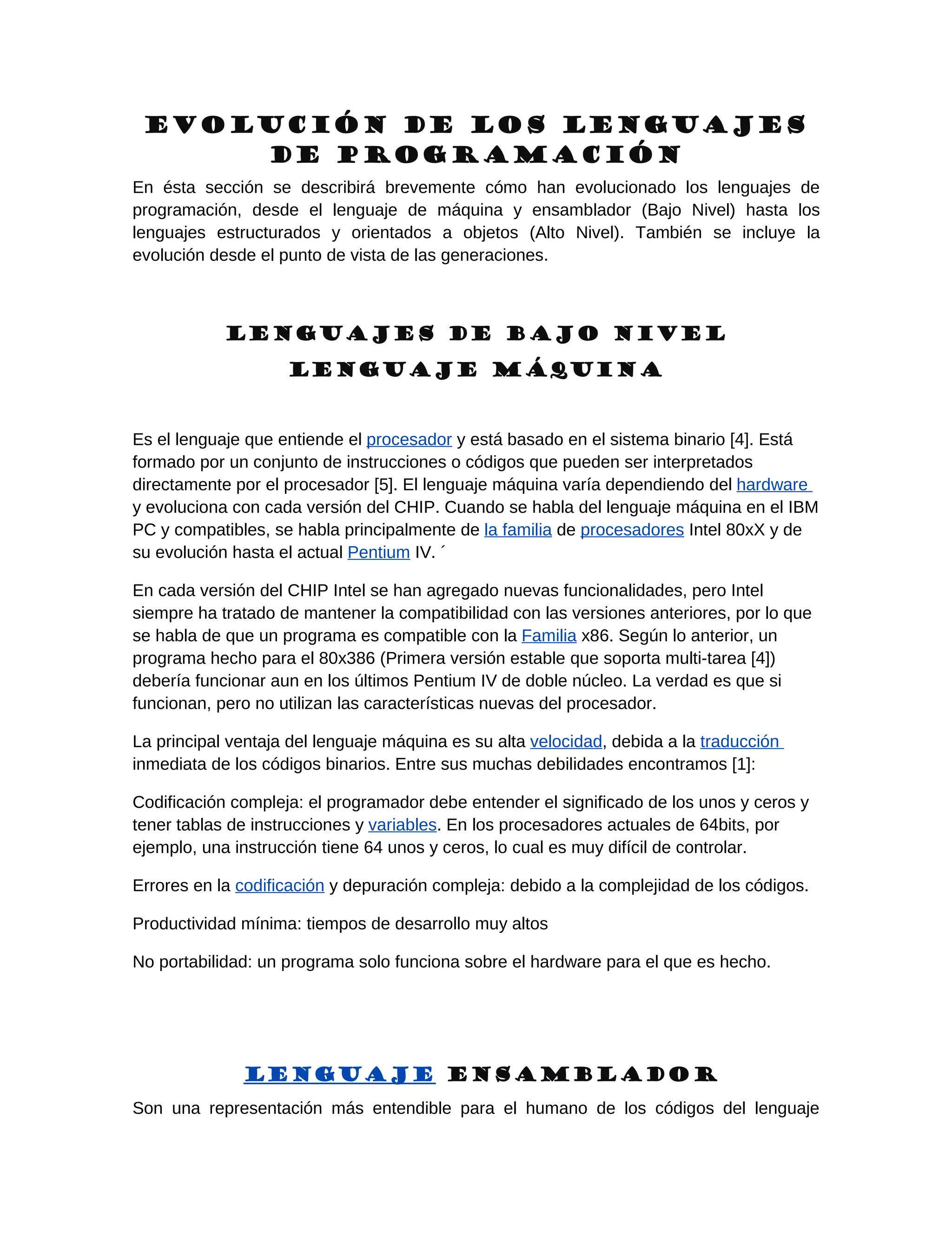 El documento describe la evolución de los lenguajes de programación, desde los lenguajes de bajo nivel como el lenguaje de máquina y el ensamblador, hasta los lenguajes de alto nivel estructurados y orientados a objetos. También discute la clasificación de los lenguajes según generaciones, con los lenguajes de primera generación siendo lenguajes de máquina, los de segunda generación siendo ensambladores, y los de tercera generación siendo lenguajes de alto nivel. Finalmente, explica conceptos clave de la programación orient