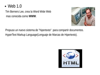 El documento describe la evolución de la web desde la Web 1.0 hasta la Web 5.0. La Web 1.0 consistía en páginas estáticas creadas por expertos. La Web 2.0 introdujo el contenido generado por los usuarios y las comunidades en línea. La Web 3.0 agregó semántica para una mejor comprensión entre humanos y máquinas. La Web 4.0 pretende ofrecer un comportamiento más inteligente y predictivo. Finalmente, la Web 5.0 busca identificar las emociones de los usuarios a través de los dispositivos