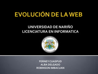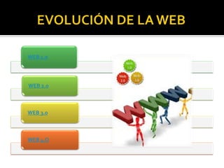 El documento describe la evolución de la Web a través de las diferentes versiones. La Web 1.0 permitía solo leer información de forma pasiva, mientras que la Web 2.0 permitió la interacción y participación entre usuarios a través de redes sociales. La Web 3.0 busca facilitar el intercambio de información de forma rápida y sencilla. Finalmente, la Web 4.0 se centrará en la integración en tiempo real entre personas y objetos a través de la comunicación inalámbrica.