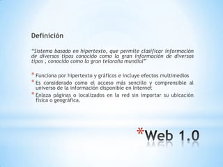 El documento define la Web semántica como una extensión de la Web en la que la información está definida por su significado, lo que permite que las máquinas y las personas cooperen mejor. También describe la Web 4.0 como una Web ubicua donde las personas y las cosas se comunican entre sí para tomar decisiones mediante tecnologías como la inteligencia artificial y el reconocimiento de voz. Para 2020, se espera que los agentes en la web aprendan y razonen como las personas.