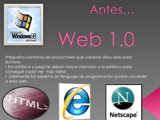 El documento aborda la evolución de la web desde la Web 1.0 hasta la Web 2.0, destacando la transición de sitios web estáticos a plataformas colaborativas y centradas en el usuario. Se enfatiza la importancia del microcontenido, la interacción social y el riesgo de compartir información personal en redes sociales. También se menciona que las aplicaciones pueden ser inestables y su evolución es continua a medida que la tecnología avanza.