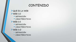 La evolución de la web se divide en tres generaciones: Web 1.0, caracterizada por páginas estáticas creadas por expertos; Web 2.0, donde los usuarios comparten y crean contenido de forma colaborativa; y Web 3.0, también conocida como web semántica, que busca hacer los contenidos más accesibles a través de la inteligencia artificial.