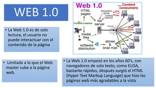 El documento describe las diferencias entre la Web 1.0, 2.0, 3.0 y 4.0. La Web 1.0 permitía solo lectura de páginas estáticas, mientras que la Web 2.0 introdujo comunidades de usuarios y contenido generado por los usuarios. La Web 3.0 es la web semántica basada en la nube que ofrece aplicaciones multi-dispositivo. La Web 4.0 proporcionará una experiencia más personalizada e inteligente aprovechando la tecnología actual.
