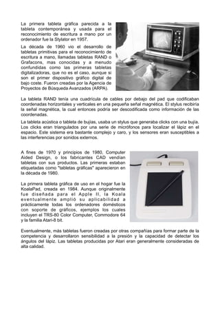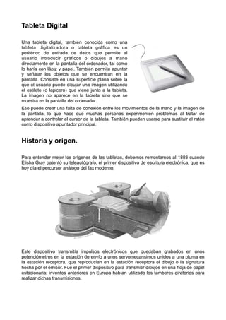 Una tableta digital es un periférico que permite dibujar directamente en la pantalla del ordenador usando un estilete como si fuera un lápiz sobre papel. Consiste en una superficie plana sobre la que el usuario puede dibujar usando el estilete, aunque la imagen aparece en la pantalla y no en la propia tableta. Existen diferentes tecnologías para detectar la posición del estilete como cables, sonido o señales electromagnéticas. Actualmente se usan principalmente tabletas pasivas que detectan la posición mediante inducción electrom