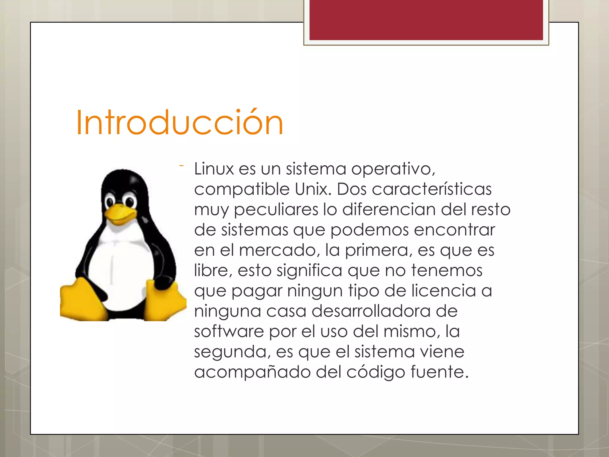 El documento resume la evolución de Linux desde su creación en 1991 por Linus Torvalds hasta 2007. Comenzó como un proyecto personal de Torvalds en la Universidad de Helsinki. Richard Stallman también jugó un papel importante al iniciar el movimiento de software libre y crear el proyecto GNU. Linux ha pasado por varias series principales (0.x, 1.x, 2.x, 3.x) con cada nueva versión agregando más soporte de hardware y software. Linux ahora se usa ampliamente en servidores, estaciones de trabajo y sistemas embebidos