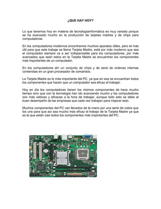 Este documento presenta un informe sobre la evolución del computador. Resume los componentes clave de los computadores modernos como la tarjeta madre y chips. Explica que los computadores del futuro probablemente tendrán nuevos sistemas operativos y dispositivos que puedan reemplazar o complementar componentes como la tarjeta madre. Además, predice que los científicos pueden inventar computadoras totalmente actualizadas con la última tecnología que combinen diferentes sistemas.