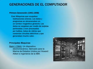 El documento describe la evolución de las computadoras a través de las diferentes generaciones, desde las primeras máquinas grandes que ocupaban habitaciones completas hasta las computadoras personales modernas. Se detalla cómo los transistores, circuitos integrados y microchips permitieron que las computadoras se hicieran más pequeñas, rápidas y eficientes a lo largo de los años. También señala cómo las computadoras se han vuelto casi imprescindibles en los hogares y oficinas en menos de 50 años desde su creación.
