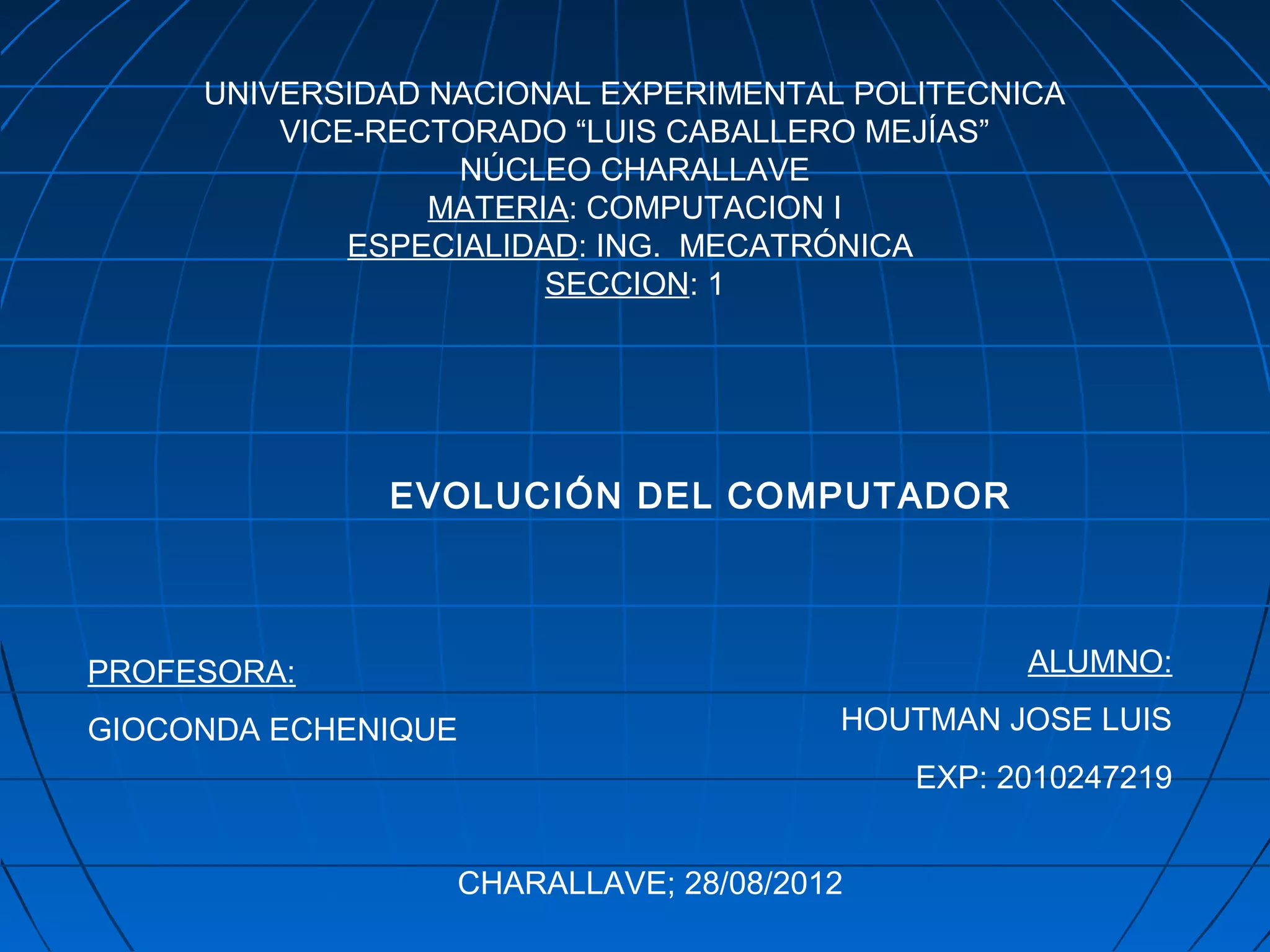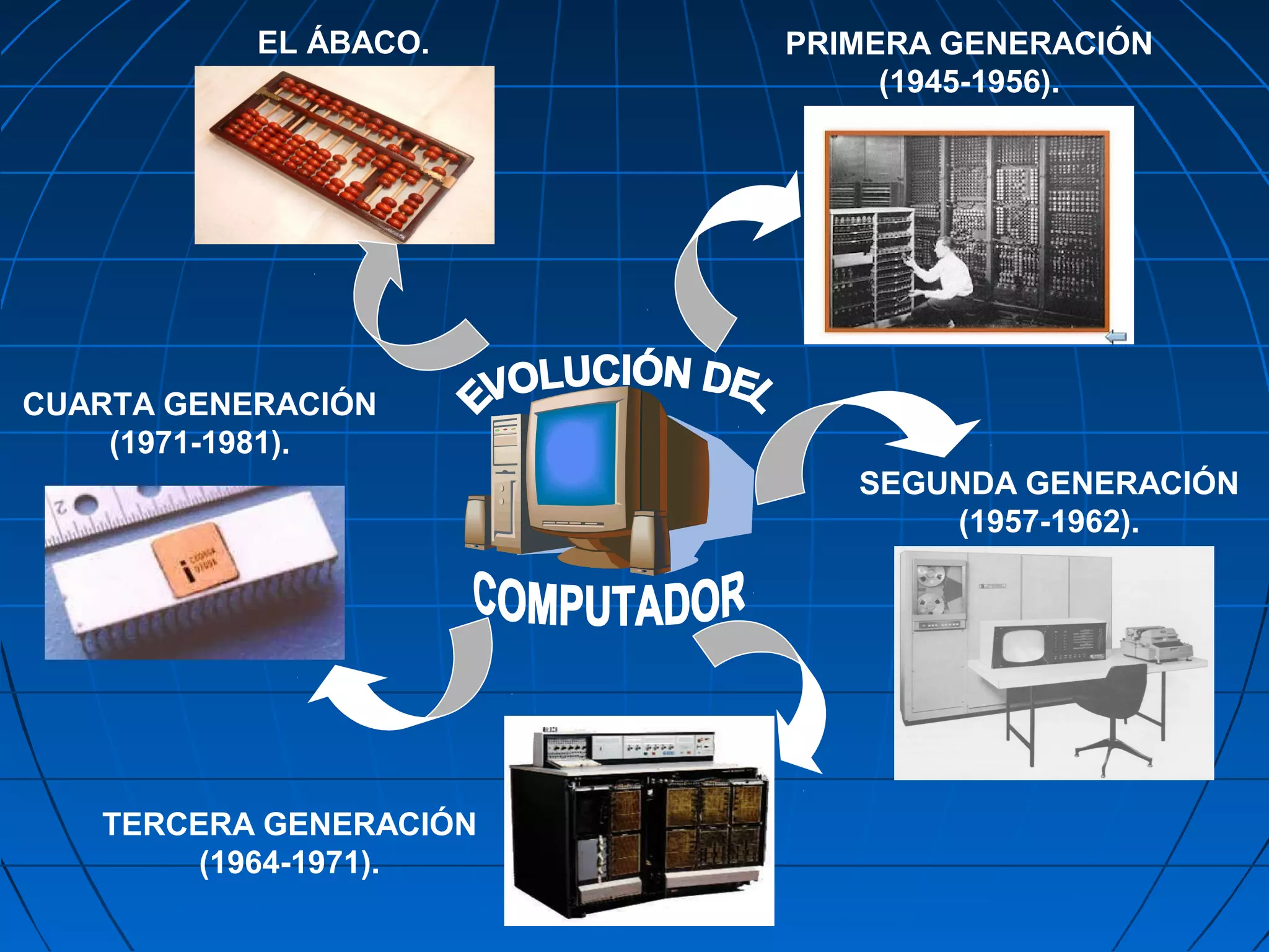 El documento describe la evolución de los computadores a través de las primeras cuatro generaciones, desde los primeros computadores basados en tubos de vacío en la primera generación hasta los computadores con transistores más pequeños, rápidos y confiables en la segunda generación. También discute brevemente el origen y uso del ábaco, un dispositivo antiguo para realizar cálculos.