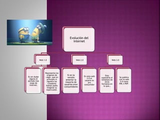 El documento describe la evolución de Internet a través de las eras Web 1.0, 2.0 y 3.0. La Web 1.0 consistía en páginas web estáticas y unidireccionales. La Web 2.0 permitió el desarrollo de blogs, wikis, foros y redes sociales que fomentaron la colaboración y compartición de conocimiento entre los usuarios. La Web 3.0 se centra en aplicaciones basadas en la nube que permiten el acceso multiplataforma a la web desde diferentes dispositivos.
