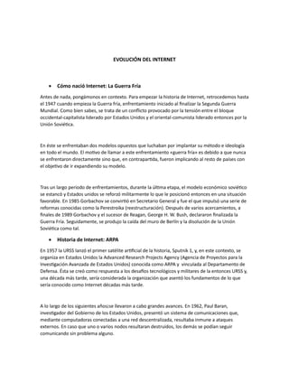 (1) Internet comenzó a desarrollarse en la década de 1960, originalmente como una red militar estadounidense llamada ARPANET para garantizar la comunicación en caso de un ataque nuclear durante la Guerra Fría. (2) ARPANET evolucionó para conectar universidades e instituciones de investigación y eventualmente adoptó el protocolo TCP/IP en 1983, dando origen a lo que hoy conocemos como Internet. (3) En 1989, Tim Berners-Lee propuso el World Wide Web basado en HTML, HTTP y el navegador web, permitiendo a