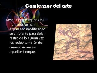 Este documento presenta un resumen de la evolución del arte a través de la historia. Comienza con el arte prehistórico y paleolítico, luego describe brevemente el arte de las civilizaciones de Egipto, Grecia y Roma. Finalmente, menciona el arte cristiano y maya.