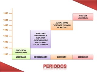 Este documento resume la historia evolutiva del imperio Inca desde sus orígenes legendarios hasta su decadencia y conquista a manos de los españoles. Destaca los principales gobernantes Incas y los periodos de expansión, consolidación y declive del imperio, incluyendo las conquistas de Pachacútec que llevaron al Tahuantinsuyo a su máxima extensión, la guerra civil entre Huáscar y Atahualpa que precedió a la llegada de los españoles, y la captura y ejecución de Atahualpa por los conquist
