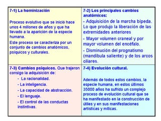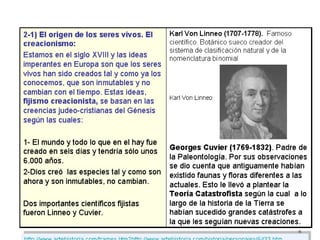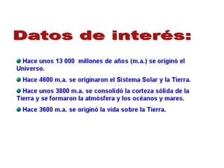 Este documento trata sobre el origen y evolución de la vida. Explica las primeras teorías sobre el origen de la vida, como la generación espontánea y la teoría de Oparin sobre el origen abiótico. También describe las primeras formas de vida procariotas y eucariotas, así como las pruebas y teorías sobre la evolución, incluyendo el lamarckismo, el darwinismo y el neodarwinismo.