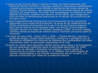 La evolución es el proceso por el que las especies cambian a través de las generaciones. Charles Darwin propuso la teoría de la evolución por selección natural en 1859, explicando cómo las especies se adaptan a través de variaciones hereditarias y la supervivencia de los mejor adaptados. Lamarck propuso antes la herencia de los caracteres adquiridos, aunque fue la teoría de Darwin la que se impuso científicamente. En el siglo XX, la síntesis evolutiva moderna integró la genética y otras disciplinas para explicar la evoluc