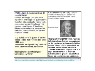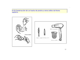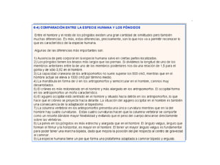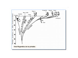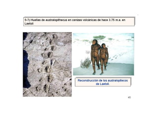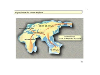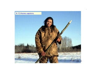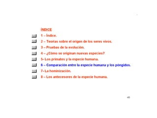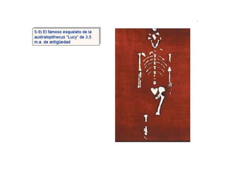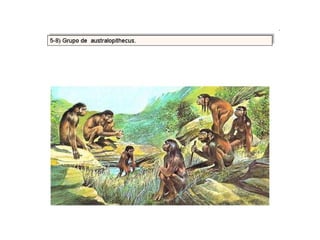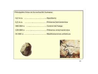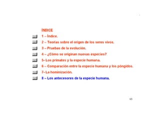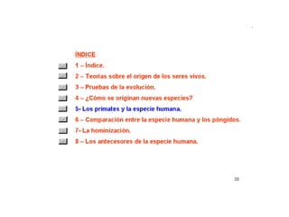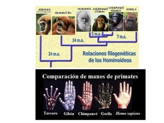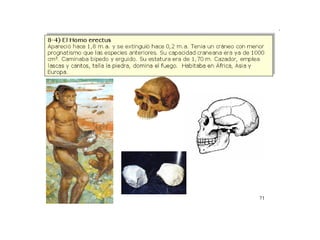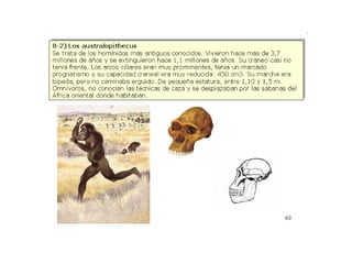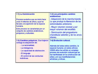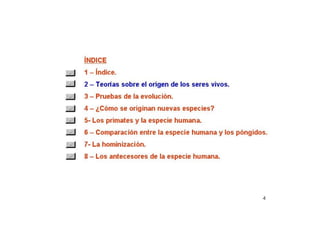 El documento habla sobre el origen y la evolución del ser humano. Explica que en Atapuerca se encontró fósiles del "Homo antecessor", uno de los primeros ancestros humanos que data de hace más de un millón de años.