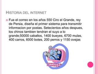 El documento resume la historia del desarrollo de Internet desde los primeros sistemas de correo en el 550 a.C. hasta el surgimiento de servicios populares como Hotmail y Wikipedia a principios de los 2000. Aborda hitos clave como el desarrollo del alfabeto binario, las primeras calculadoras programables, el surgimiento de las tarjetas perforadas y el primer mensaje enviado a través de ARPANET en 1969. También discute el establecimiento de conexiones transfronterizas en 1973, la fundación de Microsoft en 1975 y el lanzamiento del nave
