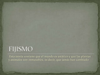 El documento presenta la evolución de las teorías sobre el fijismo y el transformismo, destacando a autores como Carl Linnaeus, Georges-Louis Leclerc y Jean Baptiste Lamarck. Se discuten conceptos como la inmutabilidad de las especies, la generación espontánea y la adaptación de los organismos a su entorno. Lamarck es mencionado como pionero en el transformismo, enfatizando la idea de que los seres vivos se adaptan y cambian gradualmente a través de generaciones.