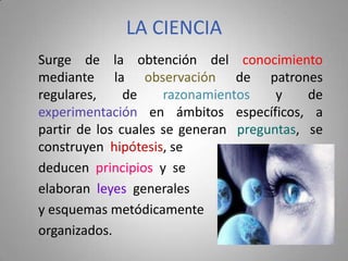 La ciencia surge de la observación de patrones y experimentación para generar conocimiento, mientras que la tecnología son conocimientos ordenados científicamente que permiten crear bienes y servicios. El desarrollo del automóvil ha evolucionado desde los primeros prototipos de vapor en el siglo XVIII hasta convertirse en una industria globalizada en el siglo XXI, con avances constantes en potencia, aerodinámica, seguridad y alternativas de combustible renovable.