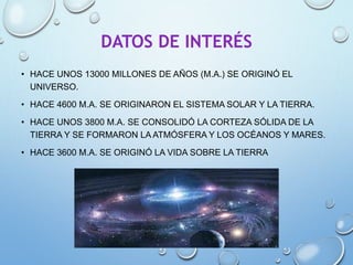 La teoría de Oparin y Haldane sobre el origen de la vida propone que moléculas orgánicas complejas se formaron espontáneamente en la atmósfera primitiva de la Tierra y se concentraron en mares primitivos. Experimentos posteriores como el de Miller apoyaron esta teoría al producir aminoácidos básicos a partir de condiciones atmosféricas simuladas. Las primeras células serían procariotas heterótrofas anaerobias que evolucionaron hasta incluir la fotosíntesis y respiración aerobia