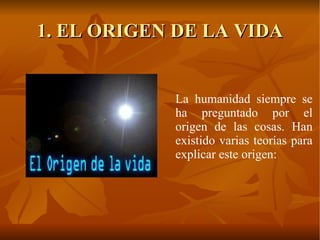 El documento resume diferentes teorías sobre el origen y evolución de la vida. Explica que inicialmente se creía en la generación espontánea, pero que luego se demostró que no es posible. Describe tres hipótesis sobre el origen de la vida: origen cósmico, aparición en la Tierra primitiva y formación de coacervados y microesferas. También resume teorías preevolutivas como el fijismo y catastrofismo, y evolutivas como el lamarckismo y darwinismo, el cual se basa en variabilidad,