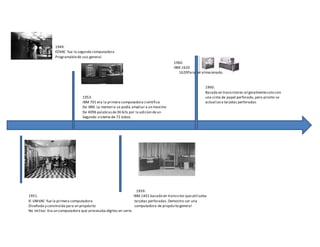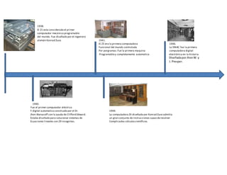 El documento resume los hitos más importantes en el desarrollo de las computadoras desde 1938 hasta 2004. Algunos de los hitos clave incluyen el Z1 de 1938 considerado el primer computador programable, la ENIAC de 1946 que fue la primera computadora electrónica digital, el UNIVAC de 1951 que fue la primera computadora diseñada para un propósito no militar, el IBM S/360 de 1964 que introdujo la microprogramación y estableció el concepto de arquitectura de familia, el Macintosh de 1984 que popularizó las interfaces gráficas de usuario y el uso