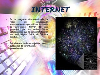 Internet es una red descentralizada de redes interconectadas a nivel mundial que utiliza los protocolos TCP/IP. Surge en 1969 con el proyecto ARPANET del Departamento de Defensa de EE.UU. para compartir recursos entre universidades asociadas. En 1985 nace la red NSFNET que utiliza TCP/IP y marca el nacimiento de Internet al conectar redes de forma global de forma estable. Ofrece servicios como la World Wide Web, correo electrónico, chat y permite acceder, comunicarse e informarse de forma descentralizada.