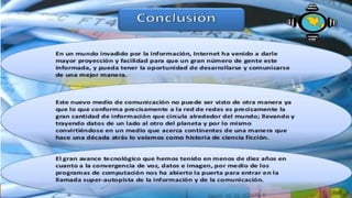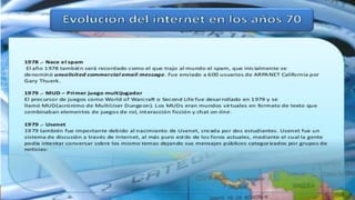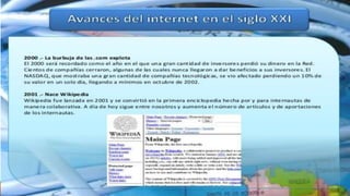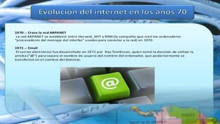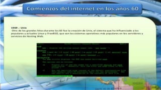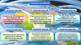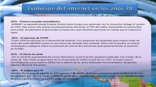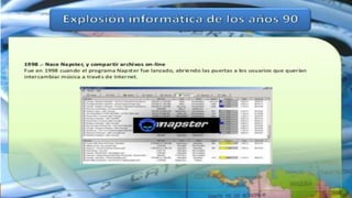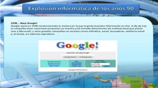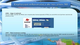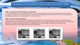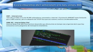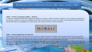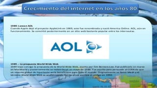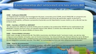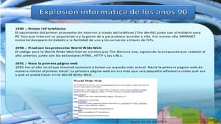 En 1989, Tim Berners-Lee creó la World Wide Web desarrollando HTML, HTTP y el navegador web. En 1993 se crearon los primeros sitios web oficiales y la NSF creó INTERNIC para administrar Internet. En 1994 se formó el W3C para estandarizar los protocolos asociados a la web.