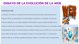 Este documento resume la evolución de la web a través de cinco generaciones: Web 1.0 permitió el acceso a información estática; Web 2.0 permitió la interacción y participación de los usuarios; Web 3.0 introdujo la inteligencia artificial; Web 4.0 integrará a las personas y objetos; y Web 5.0 incorporará las emociones de los usuarios.