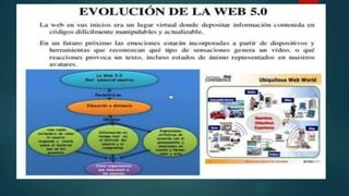 La web ha evolucionado de la Web 1.0, que solo permitía leer páginas de texto sin modificar contenido, a la Web 2.0 que permitió interacción entre usuarios en redes sociales y fácil mantenimiento de páginas. La Web 3.0 actual almacena archivos en la nube y permite usar programas web desde cualquier lugar. Se prevé que la Web 4.0 será un sistema operativo global tan potente como el cerebro humano. La web ha tenido un gran impacto mundial al permitir comunicación e intercambio de información infinita entre personas de
