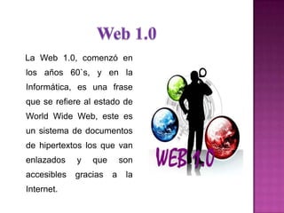 El documento resume las características principales de las versiones 1.0, 2.0, 3.0 y 4.0 de la Web. La Web 1.0 consistía en páginas web estáticas, mientras que la Web 2.0 permitió la interacción y colaboración de los usuarios a través del contenido generado por los usuarios. La Web 3.0 se centrará en la búsqueda semántica de información contextualizada. Finalmente, la Web 4.0 implicará interfaces más naturales como gafas inteligentes y diálogos con agentes virtuales.