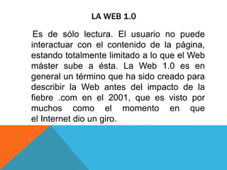 El documento describe la evolución de la web desde la Web 1.0 hasta la predicción de la Web 4.0. Explica que la Web 1.0 era de sólo lectura para el usuario, mientras que la Web 2.0 permitió el intercambio de información e interacción entre usuarios a través de blogs y comentarios. La Web 3.0 se basa en una web semántica interactiva y móvil. Finalmente, la Web 4.0 se prevé como una red ubicua inteligente donde las personas y objetos se comuniquen entre sí.