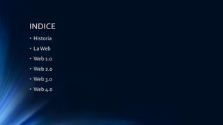 La evolución de la web, iniciada por Tim Berners-Lee en 1989, ha pasado por diferentes fases desde la Web 1.0, que era un medio unidireccional, hasta la Web 4.0, que busca una interconexión total entre personas y objetos. Cada versión ha incorporado nuevas herramientas y tecnologías, transformando la forma en que los usuarios interactúan y comparten información. Se espera que la Web 4.0 permita la comunicación inteligente y la integración total de datos en un nuevo entorno digital.