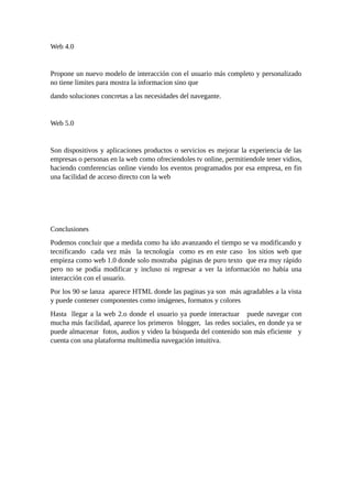El documento describe la evolución de la web desde la web 1.0 hasta la web 5.0. La web 1.0 consistía en páginas estáticas de solo texto. La web 2.0 permitió una mayor interacción entre usuarios a través de plataformas como blogs y redes sociales. La web 3.0 propuso una web semántica que mejora la interacción entre personas. La web 4.0 ofrece una experiencia más personalizada para el usuario. Y la web 5.0 busca mejorar la experiencia de empresas y personas a través de servicios como video online y conferencias.