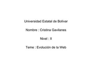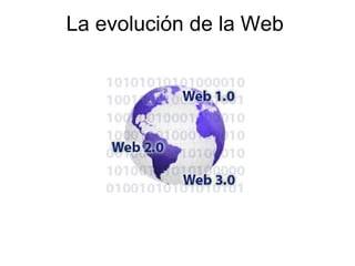 El documento describe la evolución de la Web a través de las diferentes generaciones: La Web 1.0 consistía en páginas de texto simples, la Web 2.0 introdujo características interactivas que permiten a los usuarios crear y compartir contenido, la Web 3.0 se centra en estructurar la información para que sea más fácil de encontrar, la Web 4.0 pretende que las máquinas y personas se comuniquen para tomar decisiones conjuntas, y la Web 5.0 permitirá interactuar con contenido que responda a las emociones. El documento