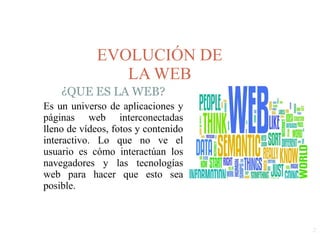 El documento resume la evolución de la web a través de cinco generaciones. La Web 1.0 consistía en páginas estáticas y unidireccionales. La Web 2.0 introdujo contenido generado por los usuarios y herramientas colaborativas como redes sociales y wikis. La Web 3.0 agregó metadatos semánticos para enriquecer la información. La Web 4.0 busca una red ubicua donde dispositivos y personas se comuniquen. La Web 5.0 propone identificar emociones y desarrollar una inteligencia artificial