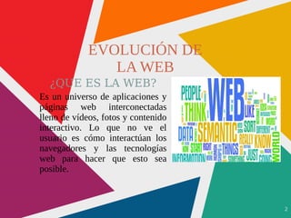 El documento resume la evolución de la web desde la Web 1.0 hasta la posible Web 5.0. La Web 1.0 consistía en páginas web estáticas y de solo lectura. La Web 2.0 introdujo sitios web colaborativos y de contenido generado por el usuario. La Web 3.0 pretende enriquecer la información con metadatos semánticos. La Web 4.0 busca conectar a las personas y objetos a través de la inteligencia ubicua. La posible Web 5.0 incluiría dispositivos todo en uno, reconocimiento de em