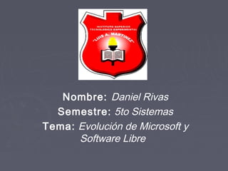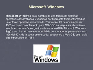 Este documento resume la evolución de Microsoft Windows y el software libre. Detalla las versiones clave de Windows como Windows 3.0, 95, 98 y ME. También describe Windows CE y su uso en dispositivos móviles y de consumo. Explica el origen del software libre en la Universidad de Berkeley y proyectos como GNU. Señala que Linux surgió de la colaboración entre Linux Torvalds y el proyecto GNU para crear un sistema operativo libre. Finalmente, resume los roles de la administración pública como promotora y usuaria del software libre.