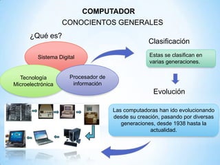 Este documento resume la evolución de las computadoras desde 1938 hasta la actualidad. Se clasifican en generaciones, comenzando con la primera generación (1938-1958) que utilizaba relés, y progresando a través de la introducción de los transistores, circuitos integrados y microprocesadores, culminando en las computadoras portátiles y supercomputadoras del siglo XXI.