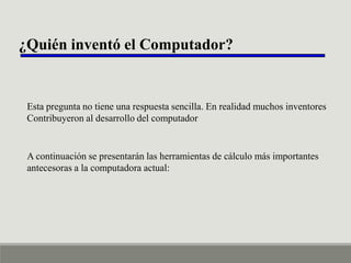 El documento describe la evolución del computador desde las primeras herramientas de cálculo mecánicas como el ábaco hasta el desarrollo de las primeras computadoras electrónicas en la primera mitad del siglo XX. Varios inventores contribuyeron al desarrollo de las computadoras modernas, incluyendo a Babbage, quien diseñó la primera computadora programable mecánica, y Turing, cuyo trabajo estableció las bases teóricas de la computación. La primera computadora electrónica funcional fue la ENIAC, construida