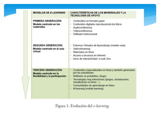 El documento describe la evolución de los modelos de aprendizaje electrónico (e-learning) a través de tres generaciones. La primera se centró en adaptar contenidos a formato web, la segunda desarrolló plataformas virtuales, y la tercera promueve el trabajo colaborativo y la producción de conocimiento. El modelo educativo actual se basa en diseñar actividades de aprendizaje centradas en el estudiante, utilizando recursos variados y fomentando la colaboración guiada por docentes.