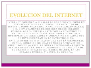Internet comenzó a finales de los años 1960 como un experimento de la Agencia de Proyectos de Investigación Avanzada del Departamento de Defensa de Estados Unidos. Experimentaron con la conexión de redes de computadoras entre universidades y compañías privadas. En 1969 se creó una red experimental con la conexión de 4 nodos a través de circuitos de 56 kbps, lo que resultó exitoso y condujo a la creación de dos redes militares similares en Estados Unidos y Europa.