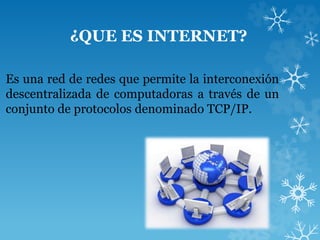 Internet es una red de redes descentralizada que permite la interconexión de computadoras a través de protocolos como TCP/IP. Su desarrollo comenzó en 1969 con la creación de ARPANET y la publicación de los primeros protocolos como FTP y TELNET para transferencia de archivos y acceso remoto entre máquinas. A lo largo de las décadas siguientes, Internet evolucionó con la adopción de protocolos como SMTP, TCP/IP e HTTP, y el crecimiento exponencial del número de usuarios y sitios conectados.