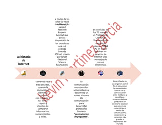 La historia de Internet comenzó hace tres décadas cuando la comunidad científica buscaba una forma rápida y efectiva de compartir información. En los años 60 se creó la ARPAnet para poner una red a disposición de los científicos, y en los 70s apareció el protocolo TCP/IP que permitió el correo electrónico y otros servicios de Internet. Originalmente desarrollada para comunicación militar y científica, Internet pronto se convirtió en el medio de comunicación más grande del mundo.