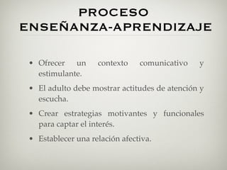 El documento describe las etapas del desarrollo del lenguaje en los niños. Comienza con la etapa prelingüística entre los 0-1 años donde se comunican a través de gestos y balbuceos. Luego entre 1-2 años ocurre la etapa de las primeras frases con las primeras palabras y estructuras simples. Finalmente entre 2-6 años es la etapa de palabra-frase donde usan palabras y frases telegráficas y aumentan su vocabulario.