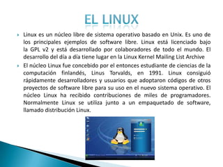 Linux es un sistema operativo libre basado en Unix desarrollado por colaboradores de todo el mundo y licenciado bajo la GPL v2. Fue concebido por Linus Torvalds en 1991 y ha recibido contribuciones de miles de programadores, adoptando códigos de otros proyectos de software libre. Actualmente es un núcleo monolítico híbrido cuyo código fuente está disponible en kernel.org.