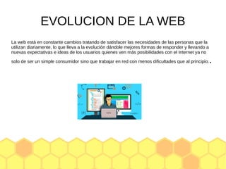 El documento describe la evolución de la web a través de cuatro generaciones: La web 1.0 permitía solo leer páginas de texto, la web 2.0 permitió navegar más rápido e implementó tecnologías como ADSL, y la web 3.0 introdujo almacenamiento en la nube y aplicaciones basadas en la web. Se prevé que la web 4.0 implementará inteligencia artificial para respuestas más rápidas a los usuarios.